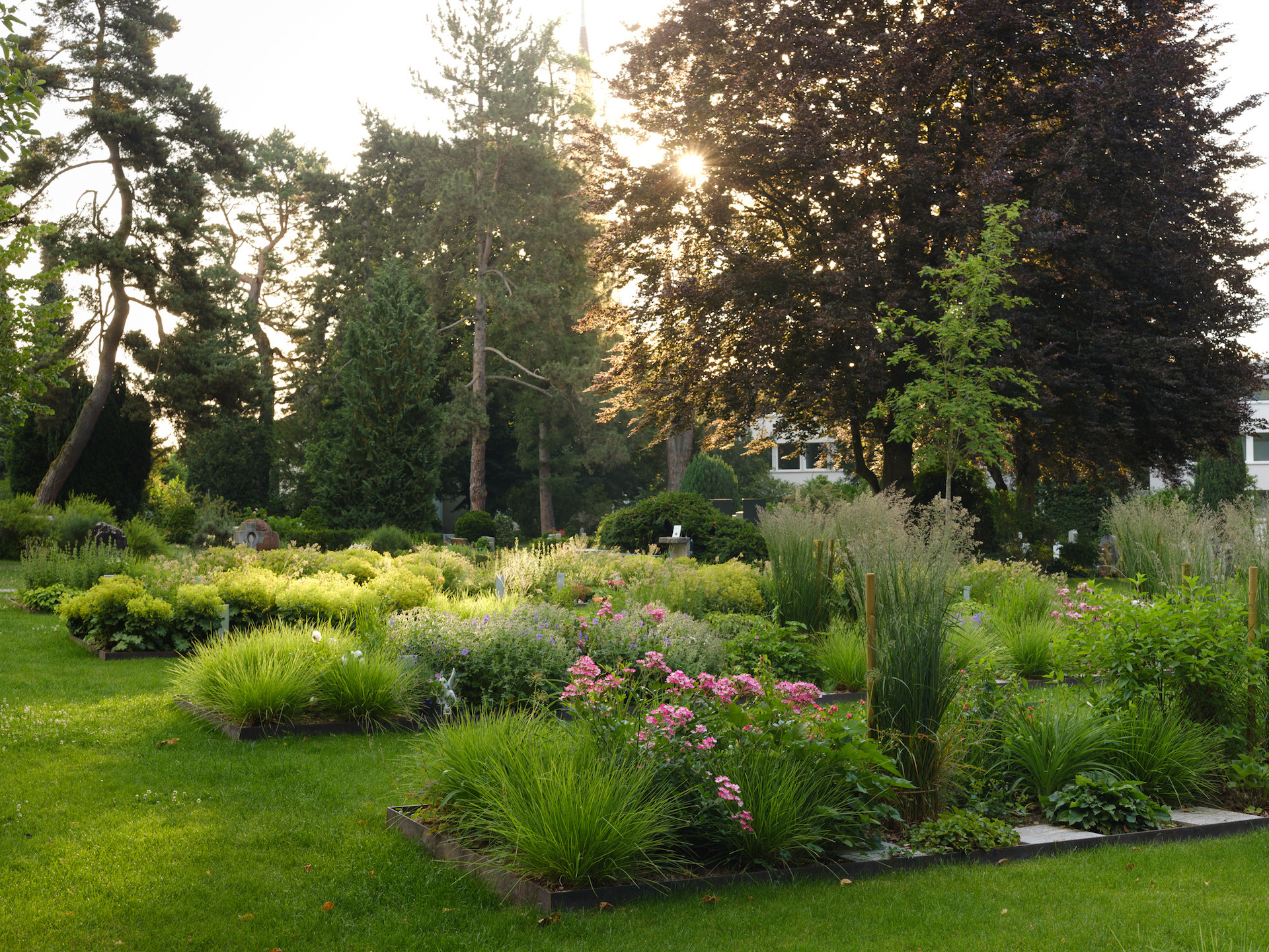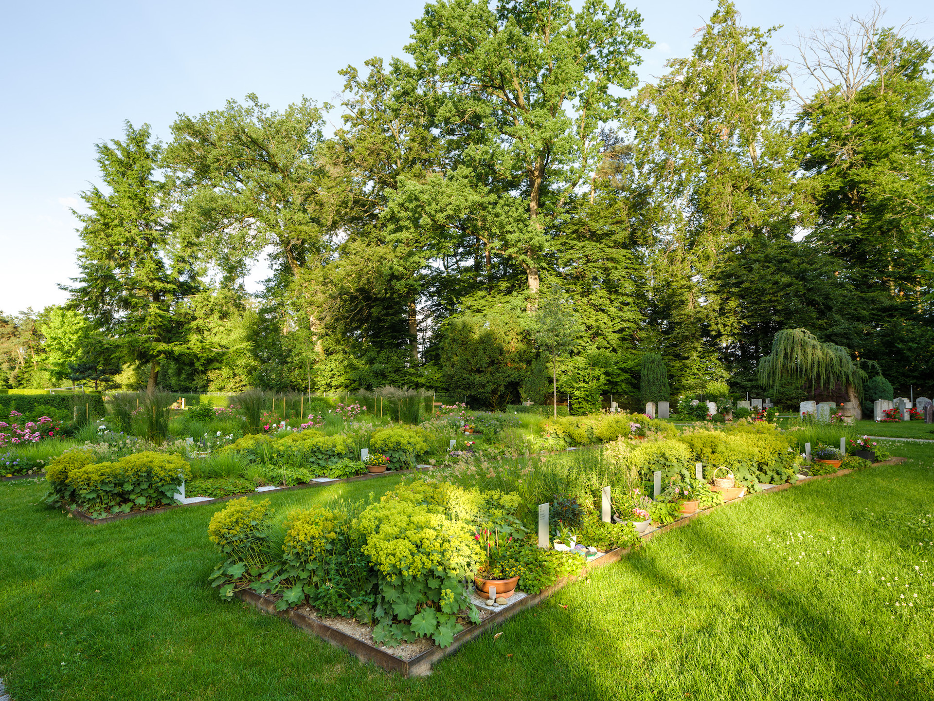 In Schmuckpflanzungen, die zum Charakter des Friedhofes passen, werden Verstorbene ihre letzte Ruhe finden können. Dabei bleibt ein klarer Bezugspunkt als Ort der Trauer, wo Angehörige Blumen aufstellen und Andenken hinterlegen können. Doppelgräber sind vorgesehen, so dass Partner nebeneinander beigesetzt werden können.Pflegearbeiten für Angehörige fallen nicht an. Auch für den Fall, dass ein Grab nur selten besucht werden kann, ruht die Asche inmitten von Blüten.