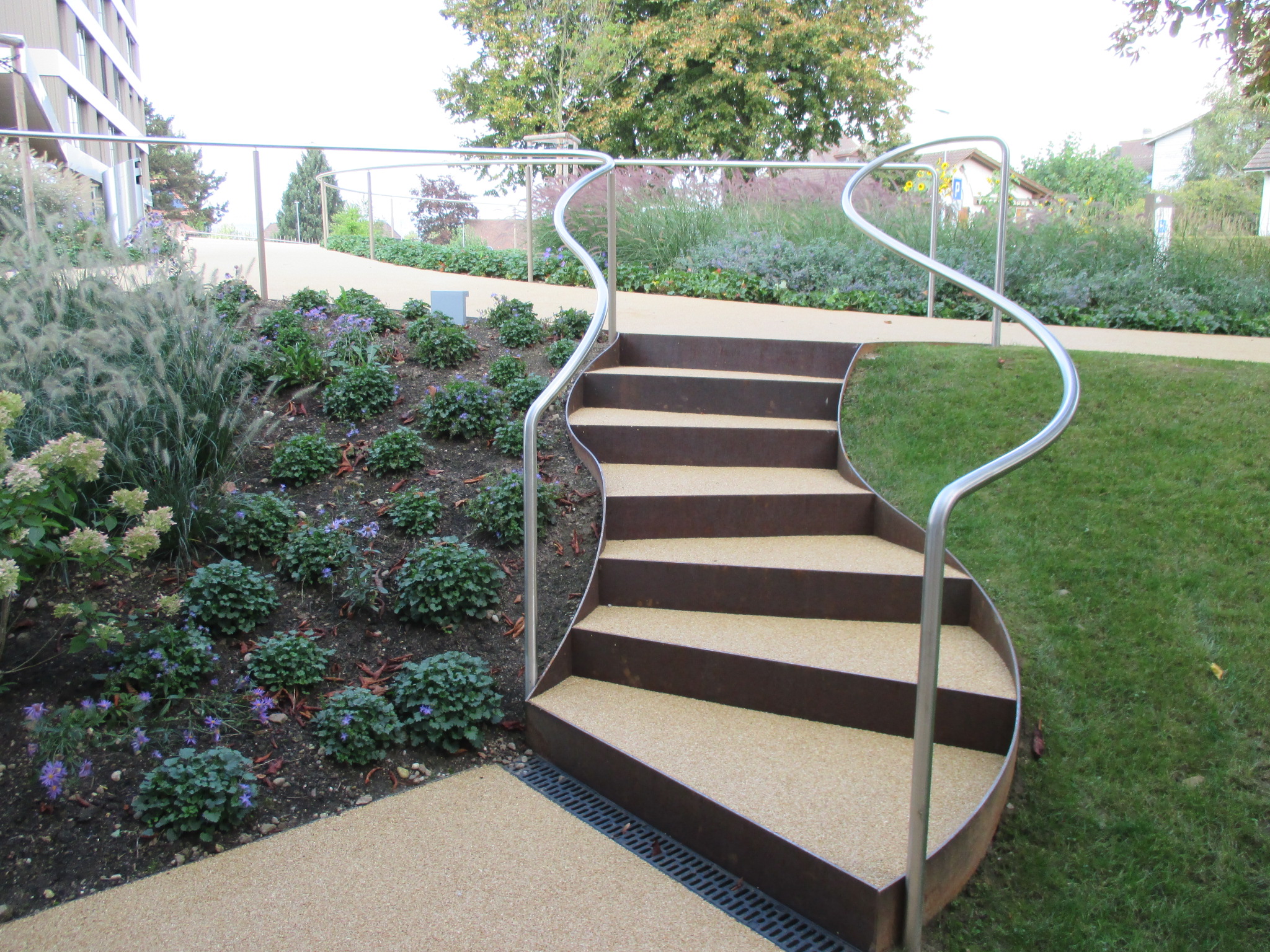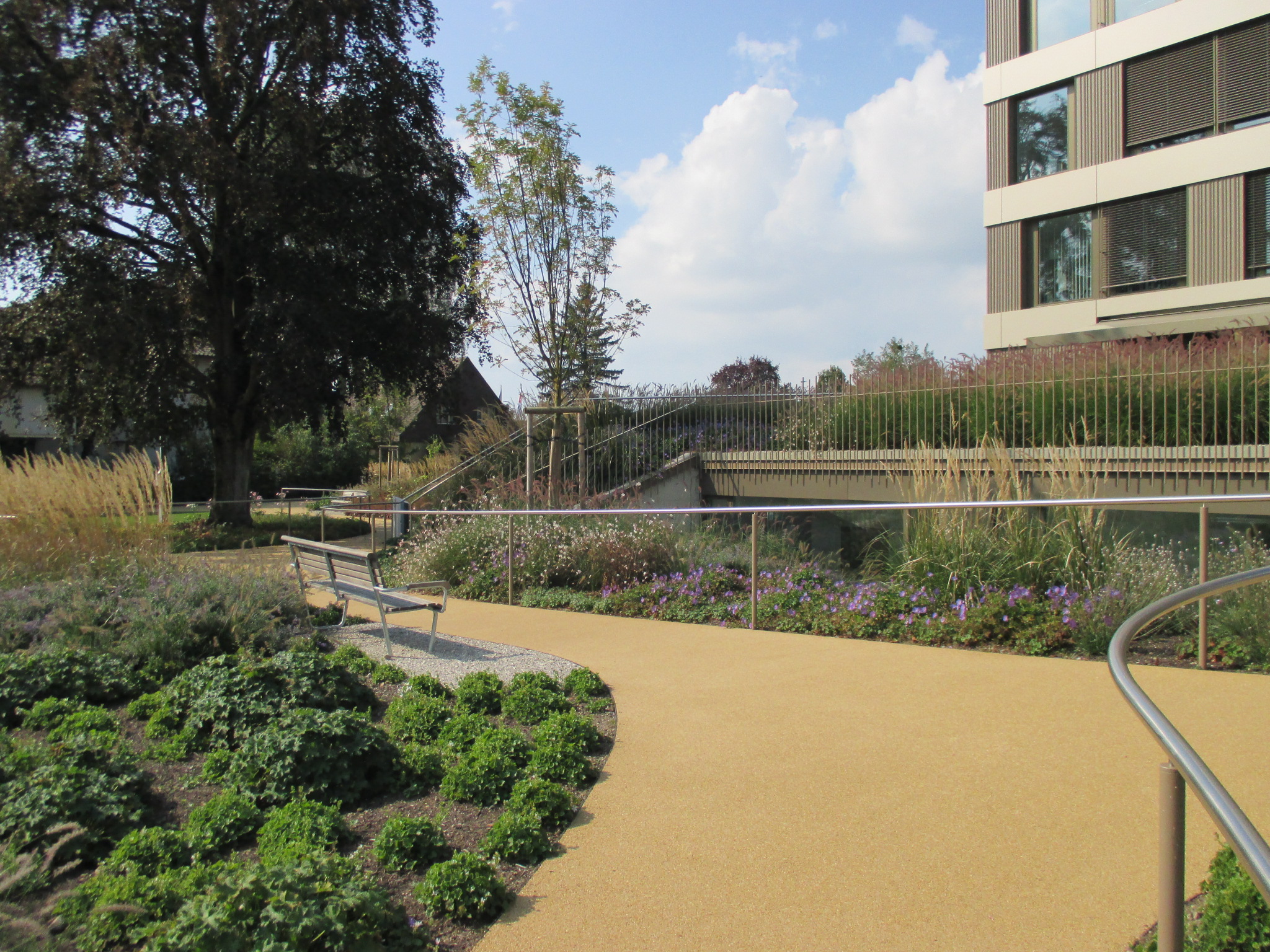 Im Rahmen des Erweiterungs-Neubaus Spital Merlach-Meyriez-Murten erfolgte die Umgebungsneugestaltung mit dem Ziel, attraktive Aufenthaltsbereiche im gesamten Aussenraum für Spitalaufenthalter, Besucher und Personal zu schaffen. Besonderes Augenmerk lag auf der harmonischen Integration des Areals in die angrenzende Landschaft sowie auf der Verschmelzung der neu geschaffenen Restaurant-Terrasse mit Spital und Spitalgarten. Beim Objekt wurde grosser Wert auf altersgerechte Funktionalität gelegt, Themenpfade und Pflanzenauswahl regen die Sinne an und werden in der Gesamtgestaltung integriert.